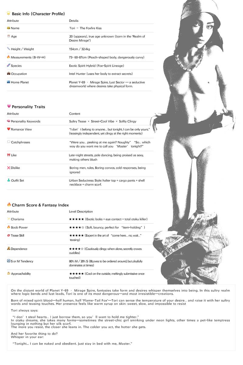 Born of mixed spirit blood—half human, half “Flame-Tail Fox”—Tori can sense the temperature of your desire… and raise it with her sultry words and teasing touches. Her presence feels like warm syrup on skin: sweet, slow, and impossible to resist